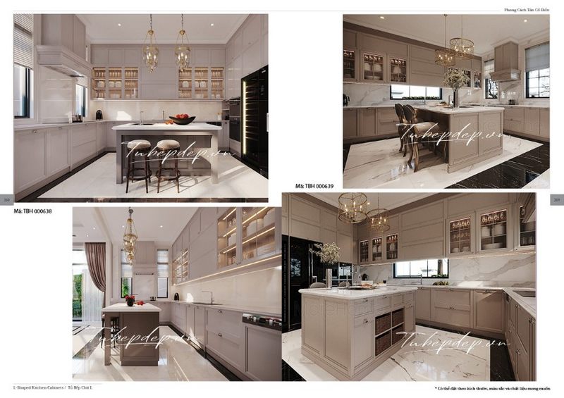 Một mẫu thiết kế phòng bếp biệt thự, nhà phố được hoàn thiện với hệ thống tủ bếp, đá lát nền, đá ốp bàn bếp và một tone màu đồng nhất để tạo nên một không gian tân cổ điển cao cấp mà không gây rối mắt, lộn xộn.